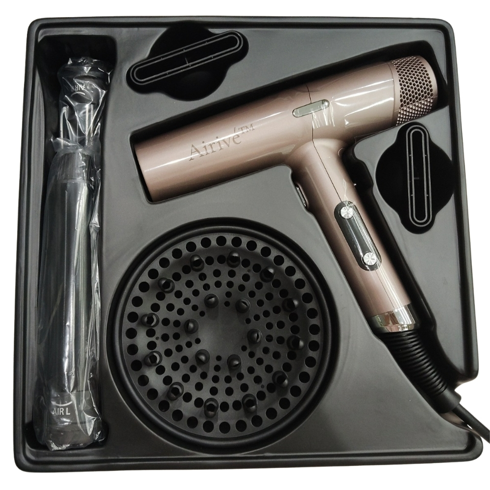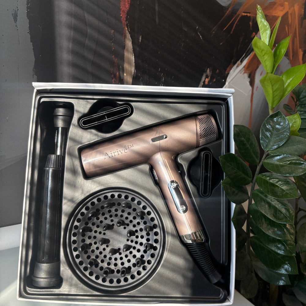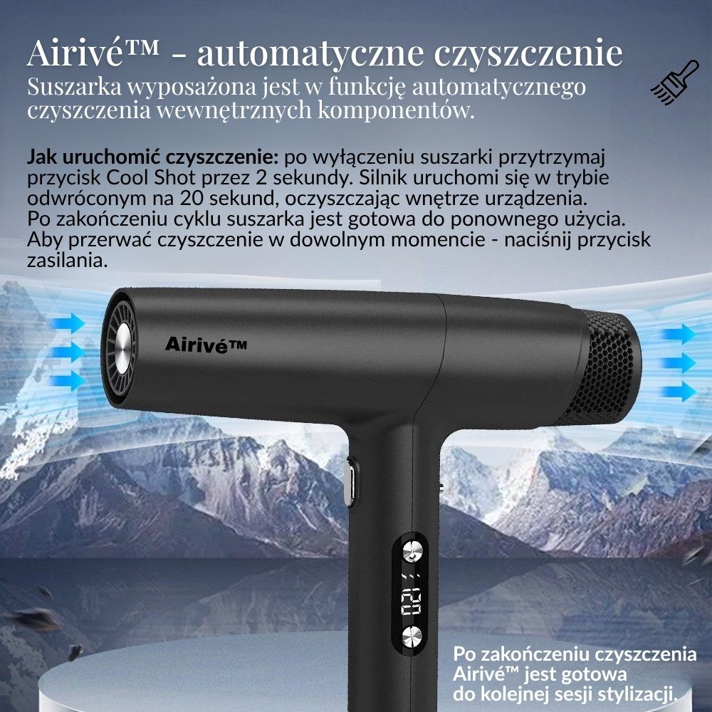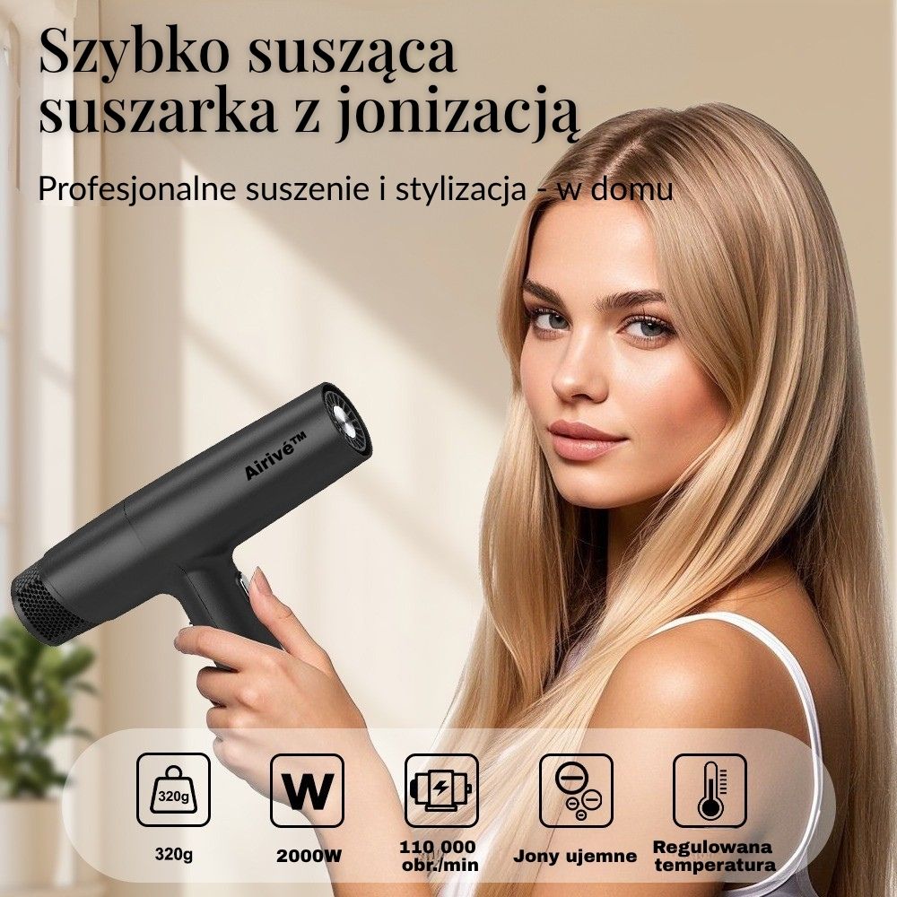 Airivé™ – suszarka do włosów infrared – to profesjonalna suszarka do włosów łącząca trzy technologie: promieniowanie podczerwone, silnik bezszczotkowy 110 000 obr./min oraz jonizację ujemnymi jonami. Lżejsza, cichsza i szybsza niż tradycyjne suszarki – zapewnia zdrowe, gładkie i lśniące włosy bez ryzyka przesuszenia.